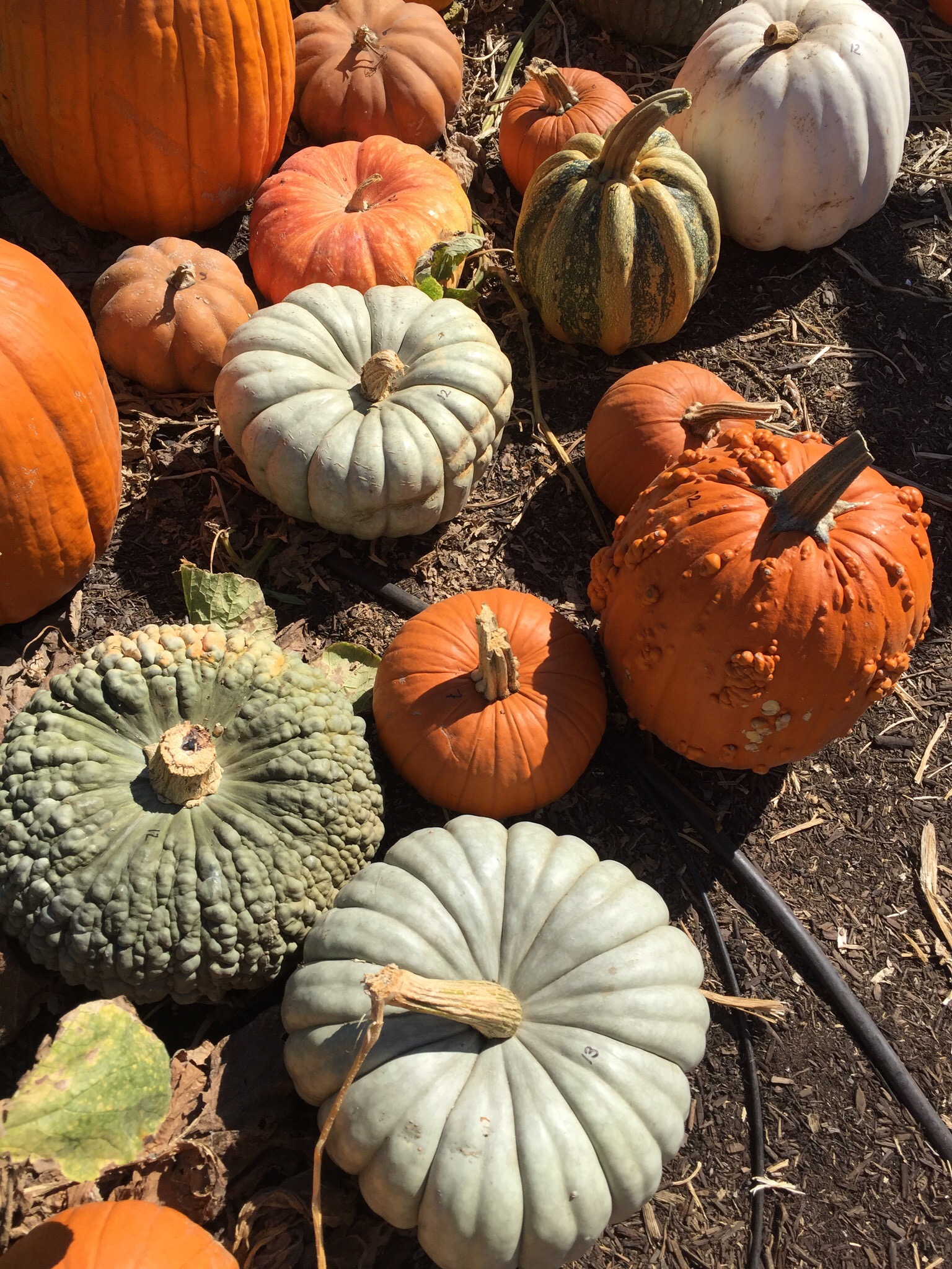Our trip to the pumpkin patch was a success! We both found perfect orange pumpkins, and we snagged a green and white one as well. We always frequent the same patch: the Post Street Pumpkin Farm in Santa Cruz. We love it because it’s this little farm tucked in the industrial part of town, and we love to support local businesses. Plus, they always have a great assortment of things to pick from: they also grow dahlias, tomatoes, Christmas trees, and they keep bees!