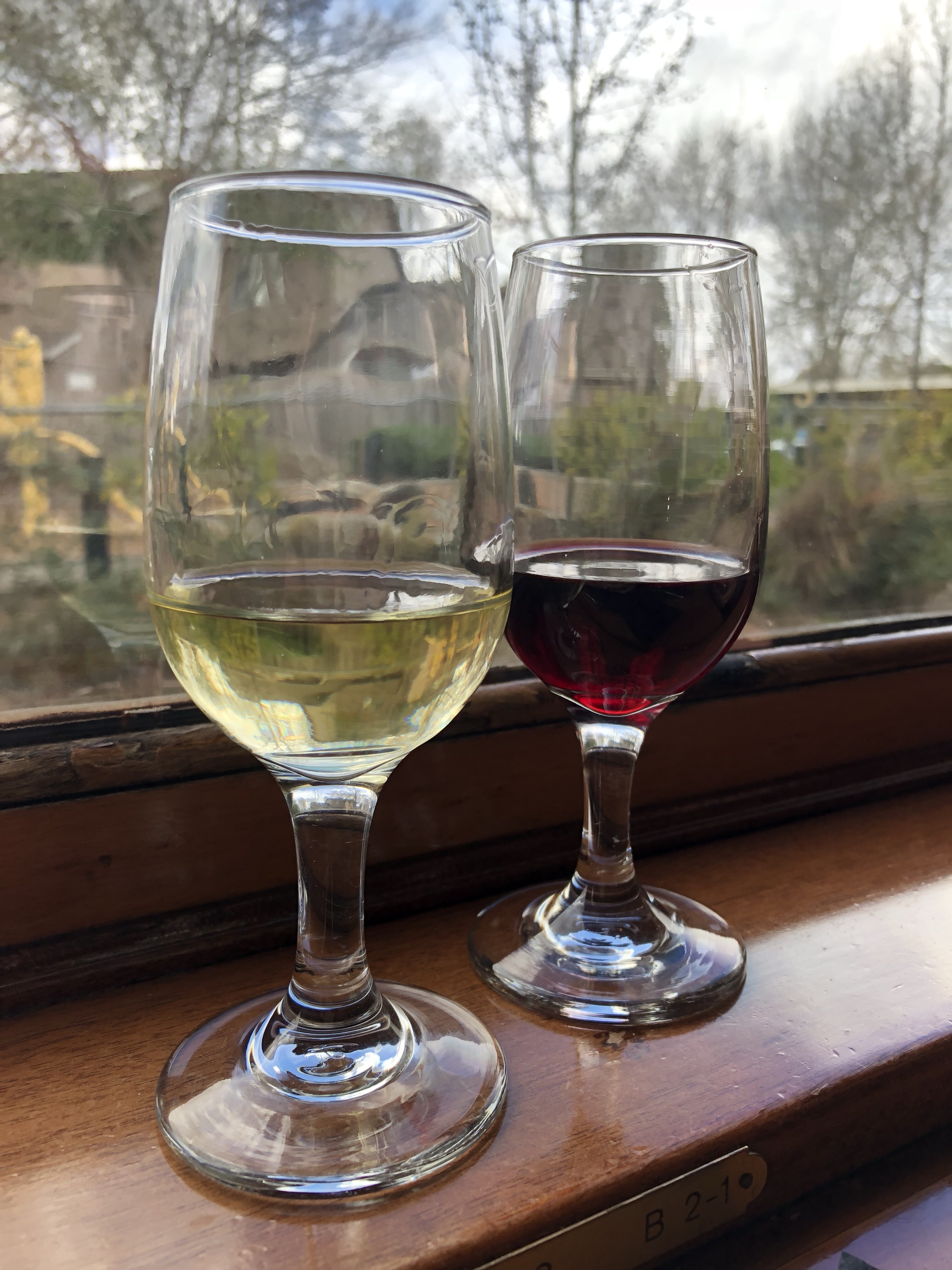 When we arrived in our designated train car, we were able to snag two tables because of the size of our party, but the seats also look super comfortable.When the train started, we were greeted with a complimentary glass of merlot or chardonnay, as well as an appetizer plate with various fruits, nuts, cheeses, and meats. We rode in the caboose, which almost always happens to me when I’m on a train! The rain was pouring outside, and it was so relaxing to sip on wine and watch the rain pour over the many fields of grape vines.